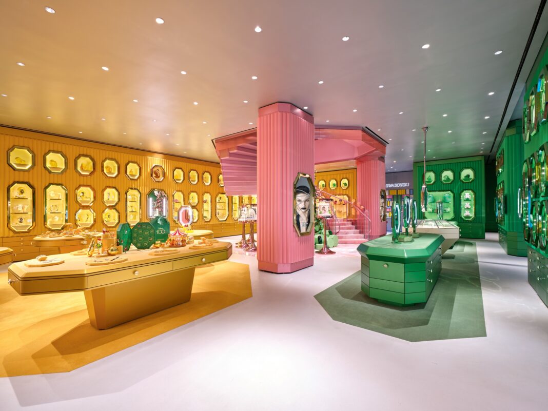Swarovski na Fifth Avenue to kolorowa eksplozja w typowych dla marki barwach. Wejście do sklepu jest otoczone przez dwa ogromne kryształy, a ściany są pokryte licznymi ośmiokątami, tworzącymi zachwycające wystawy produktów o niezrównanym pięknie i kunszcie. Koncepcja jest hołdem dla cudowności samego kryształu. Symboliczny ośmiokąt Swarovskiego jest obecny w całym sklepie, od gablot na ścianie i ośmiokątnych przymierzalni, po kryształowe uchwyty i lusterka ręczne w kształcie ośmiokąta.